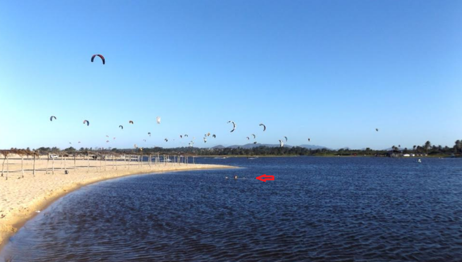 | Seta vermelha me identificando; atrás, uns 40 kitesurfistas |