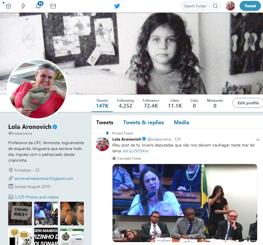 Apesar de seguir o rapaz, eu não o conheço. Nos últimos meses decidi ser menos seletiva sobre quem seguir. Antes eu demorava pra seguir alguém, tinha que conferir nossas afinidades e tal. Mas comecei a achar injusto eu ter tantos milhares de seguidores (um número que aumentou com maior rapidez durante as eleições, e hoje está em mais de 72 mil) e seguir tão pouca gente. Quero dizer, não era tão pouca, já eram mais de mil e poucas, o que é muito mais gente que eu conheço na vida real. Agora já estou seguindo quase 4 mil e 300 pessoas. Se a pessoa é gentil, interage comigo, faz um tuíte bacana, se é feminista e/ou professor(a) e eu vejo que me segue, eu sigo de volta.