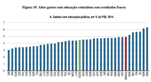 No entanto, pela disparidade dos gastos durante os níveis educacionais, no ensino básico o gasto é inferior à média da OCDE, justificando os resultados fracos da educação brasileira nos padrões internacionais.