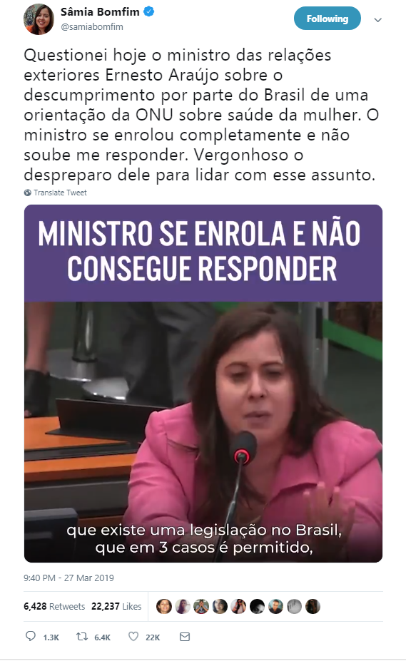 Mas nem tudo foi esse show de horrores. Ontem a maravilhosa deputada federal Sâmia Bonfim (Psol-SP) colocou o sinistro das Relações Exteriores Ernesto Araújo contra a parede (veja o vídeo). O Brasil mais uma vez deu vexame na ONU ao descumprir orientações sobre a saúde das mulheres. Sâmia lembrou que o tema de saúde reprodutiva e sexual envolve muitos outros, como planejamento familiar, gravidez na adolescência, mortalidade materna, acesso a contraceptivos, combate a doenças venéreas. O sinistro teve a pachorra de dizer que, pro governo, dentro "desse assunto vem, de contrabando, a promoção do aborto". Taí um olavete falando com todas as letras que promover medidas contraceptivas, por exemplo, promove o aborto! Como tudo nesse governo, nada faz sentido.